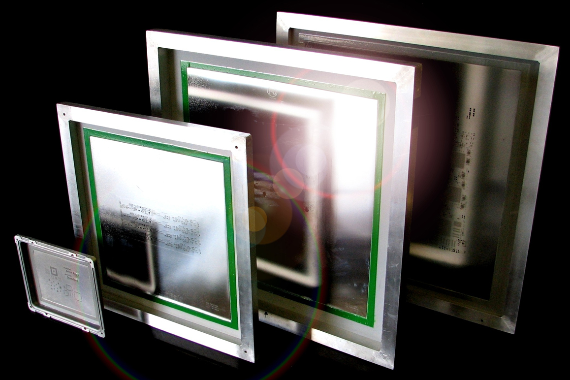 Framed stencils are unsurpassed for use in production runs where stencil performance is critical. Foils are stretched with specially designed polyester mesh attached to a rigid aluminum frame. This guarantees absolute flatness and allows for superb printing results from the first print to the last.