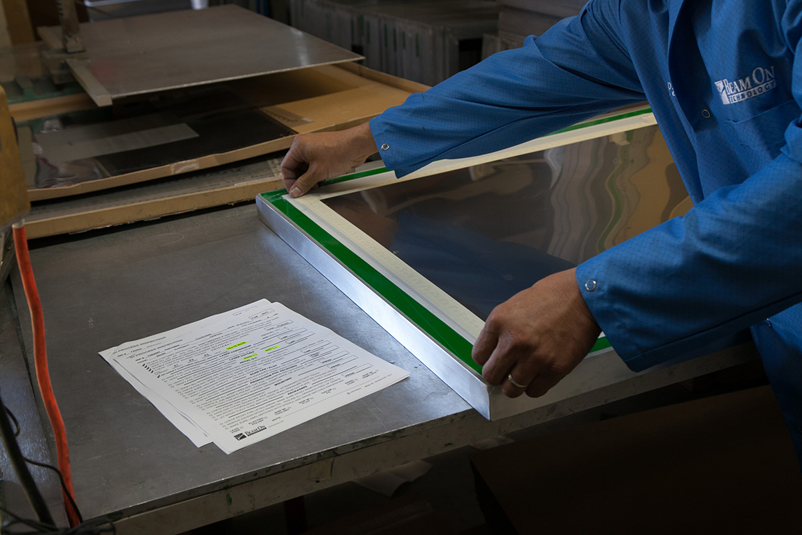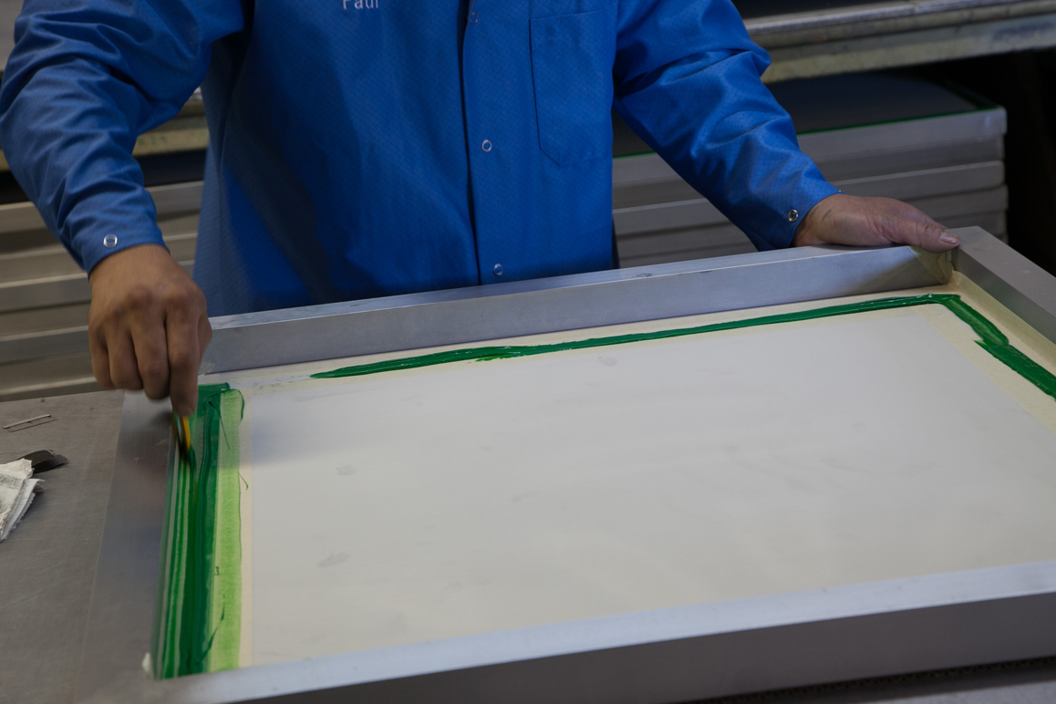 Order papework is reviewed and the proper frame type and epoxy color is chosen. The foil is then carefully positioned on a frame prestretched with high tension polyester mesh. It is then secured to the mesh with mask.