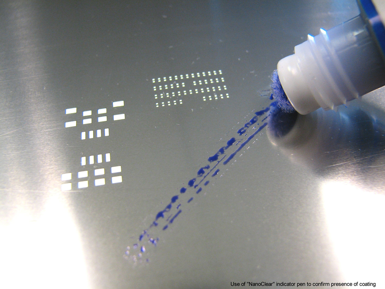 Nano coating is a thin hydrophobic (water repellent) and oleophobic (oil repellent) treatment used on the undersides of solder paste stencils. It provides a non-stick surface that not only reduces the number of cleaning cycles required during the paste printing process, but also improves paste transfer efficiency for very small openings. Upon application, the less than 5 nanometer coating bonds with the stencil foil at the microscopic level and will not alter the stencil opening size or foil thickness. Nano coating is an industry proven process which shows immediate and measurable improvement from the first print and can even be applied to previously used stencils. Contact our sales staff for pricing and other available services.